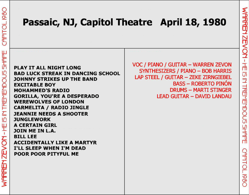 Warren Zevon: He Is In Tremendous Shape – Capitol Theatre, Passaic, NJ April 18, 1980 Live Concert (1CD)